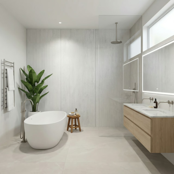 Panel ścienny BOLD Mineral w kolorze białym to nowoczesny materiał wykończeniowy o wymiarach 3000×1200 mm. Wykonany z kompozytu kwarcowo-polimerowego wytłaczanego pod wysokim ciśnieniem, zapewnia wyjątkową trwałość. Charakterystyczna pionowa struktura z głębokimi żłobieniami odwzorowuje estetykę surowego betonu architektonicznego. Grubość zaledwie 7 mm pozwala na montaż bez znaczącej ingerencji w przestrzeń.