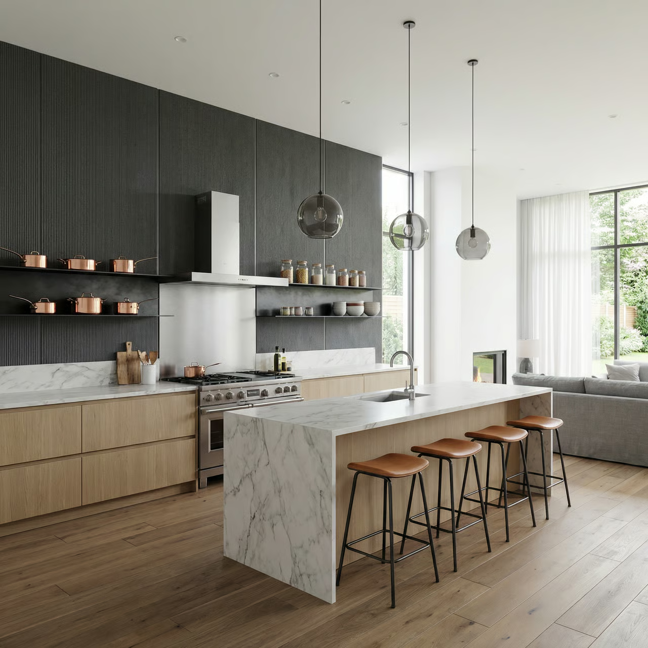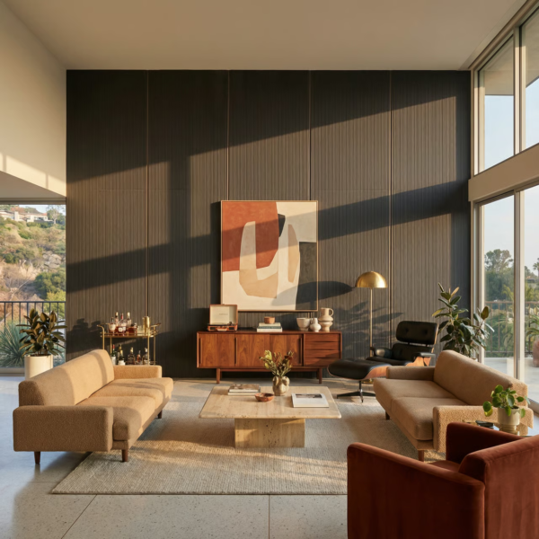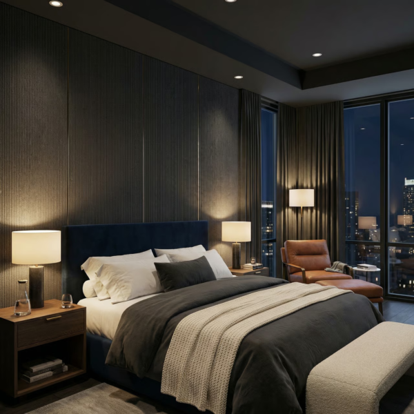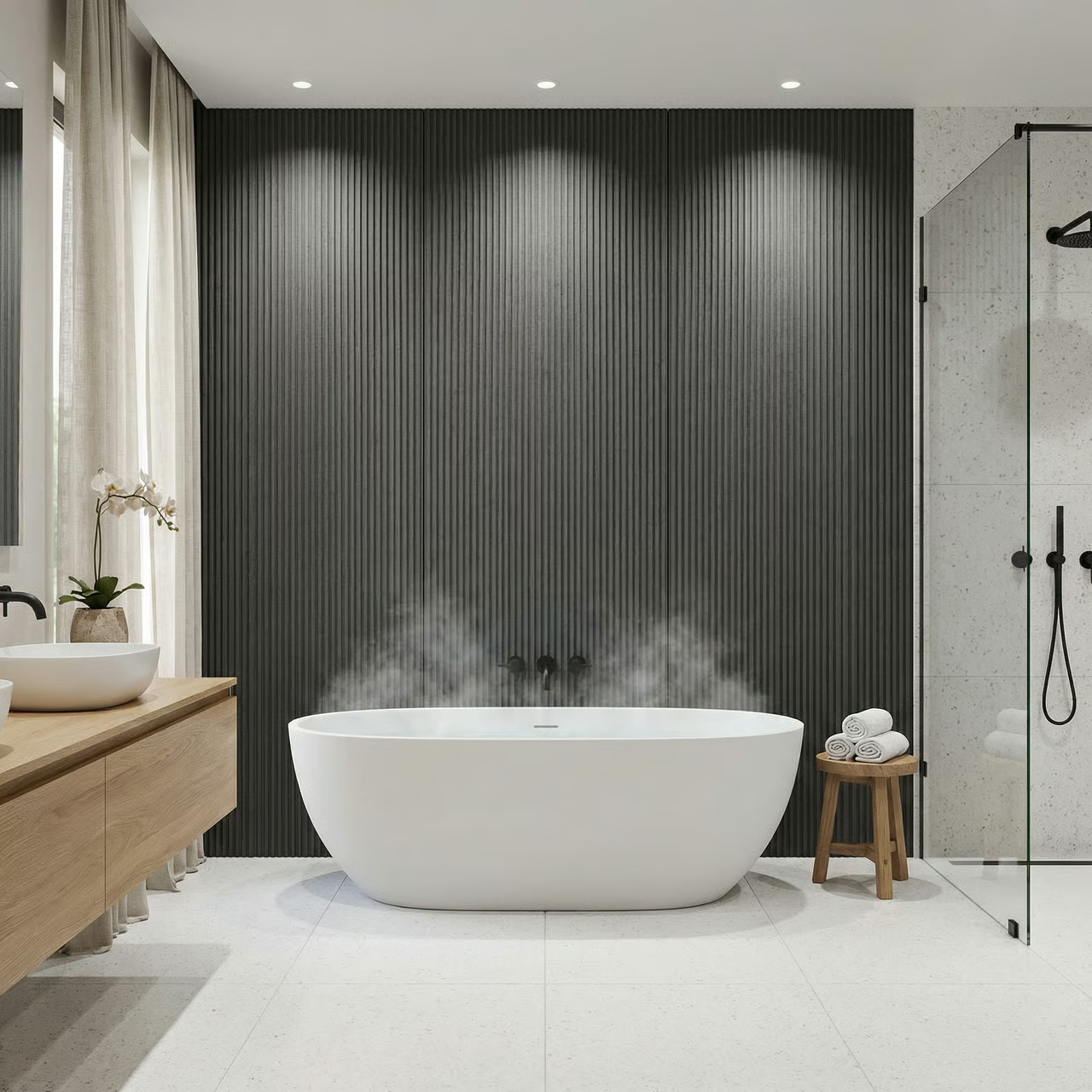 Panel ścienny BOLD Mineral Grafit o wymiarach 3000×1200 mm to nowoczesny materiał wykończeniowy w stylu industrialnym. Wykonany z kompozytu kwarcowo-polimerowego wytłaczanego pod wysokim ciśnieniem, łączy trwałość z estetyką surowego betonu. Charakterystyczna pionowa struktura z głębokimi żłobieniami odwzorowuje naturalne minerały w odcieniu ciemnego grafitu. Grubość zaledwie 7 mm pozwala na montaż bez znaczącej ingerencji w przestrzeń.