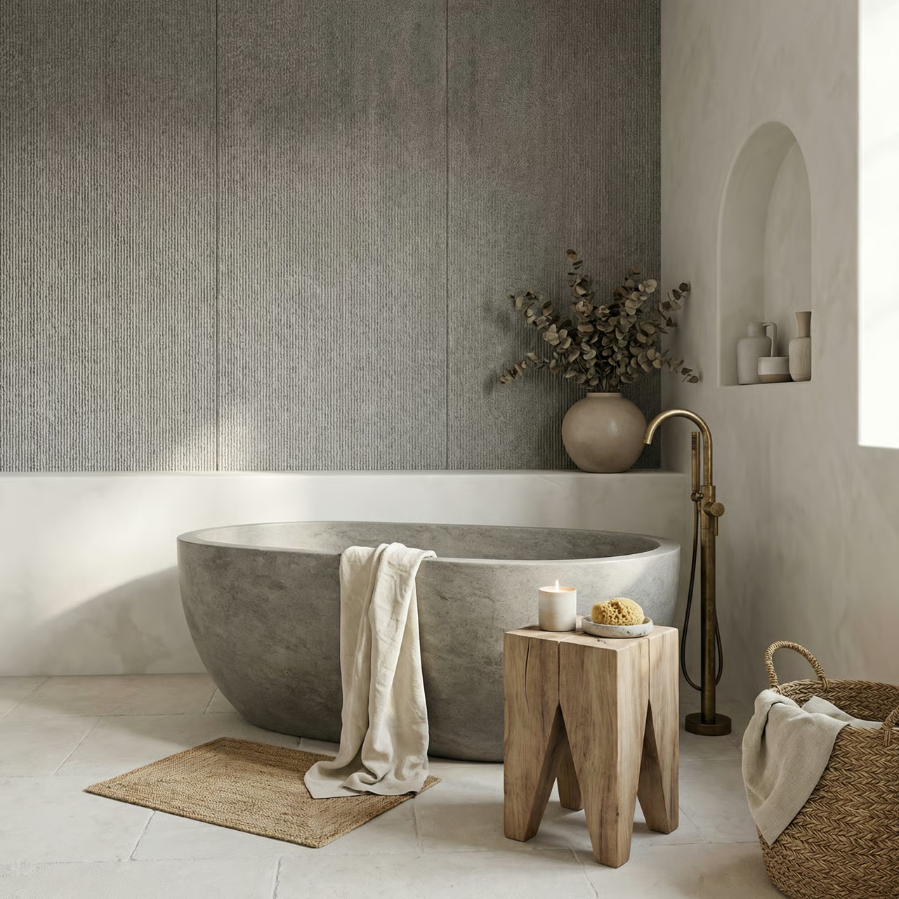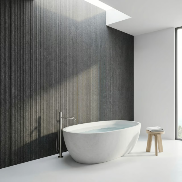Panel ścienny Line Mineral Grigio o wymiarach 3000×1200 mm to nowoczesny materiał wykończeniowy wykonany z kompozytu kwarcowo-polimerowego. Powierzchnia charakteryzuje się pionowymi żłobieniami tworzącymi teksturę szczotkowanego kamienia w grafitowym odcieniu. Grubość zaledwie 7 mm umożliwia montaż bez ingerencji w przestrzeń pomieszczenia. Wodoodporność i elastyczność konstrukcji pozwalają na zastosowanie w łazienkach, kuchniach oraz na elewacjach zewnętrznych.