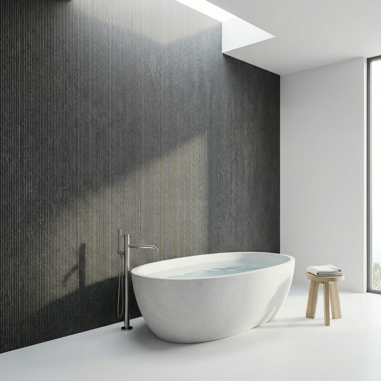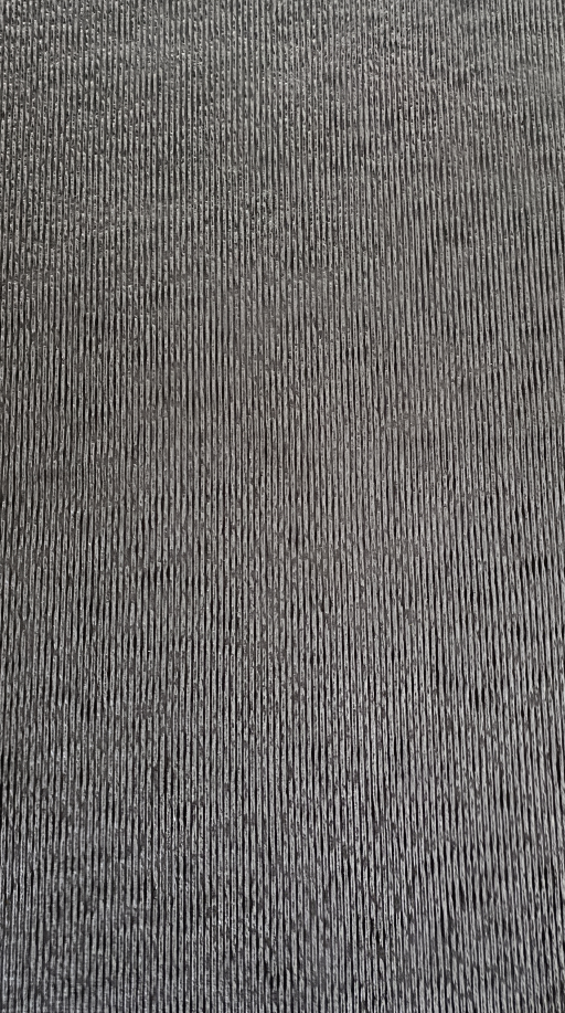 Precyzyjna tekstura pionowych, drobnych żłobień · Regularna, liniowa struktura na całej powierzchni · Efekt szczotkowanego kamienia lub ryflowanego betonu · Minimalistyczny, uporządkowany wzór o subtelnej trójwymiarowości · Kolor ciemny grafitowy z ciepłym podtonem i naturalną grą światła i cienia