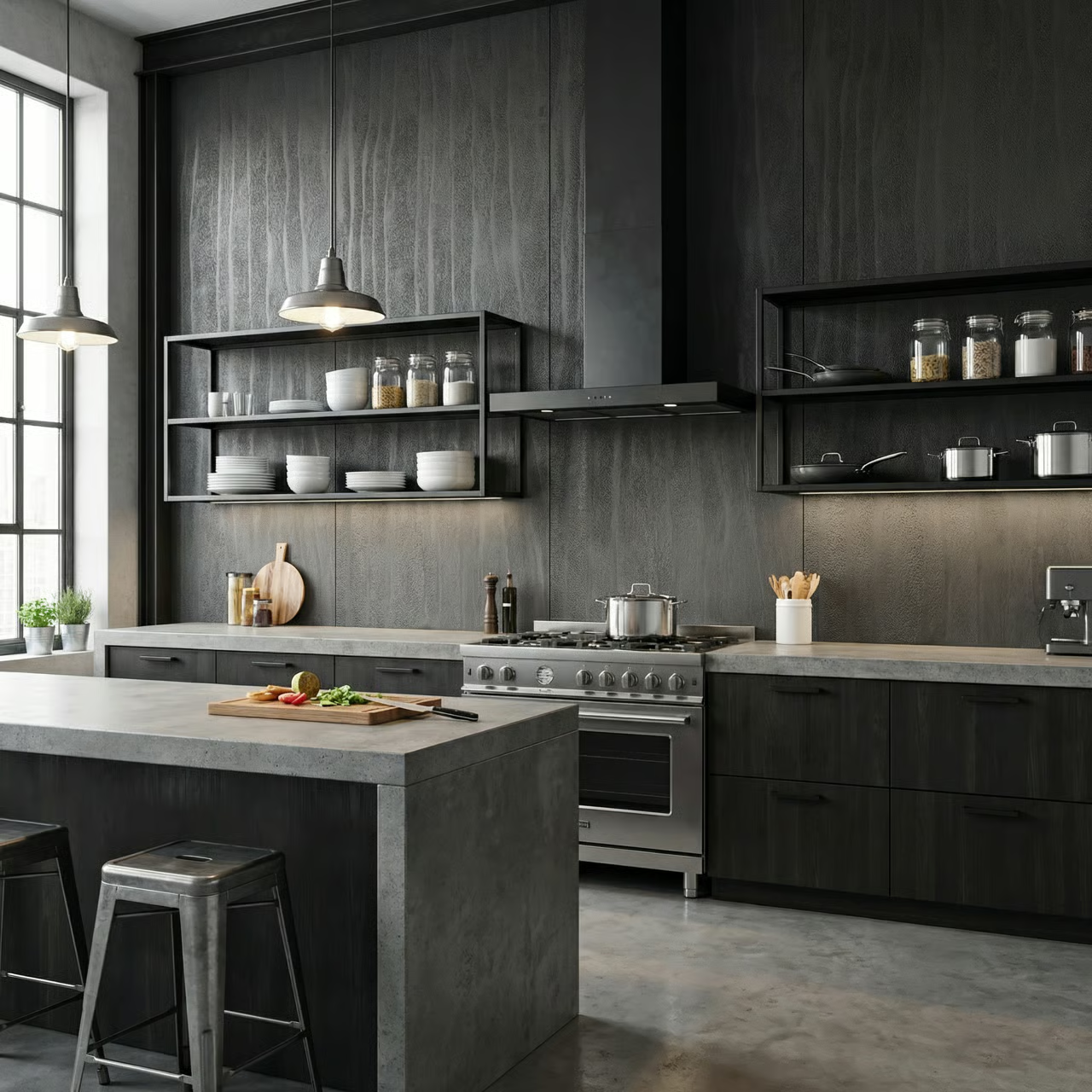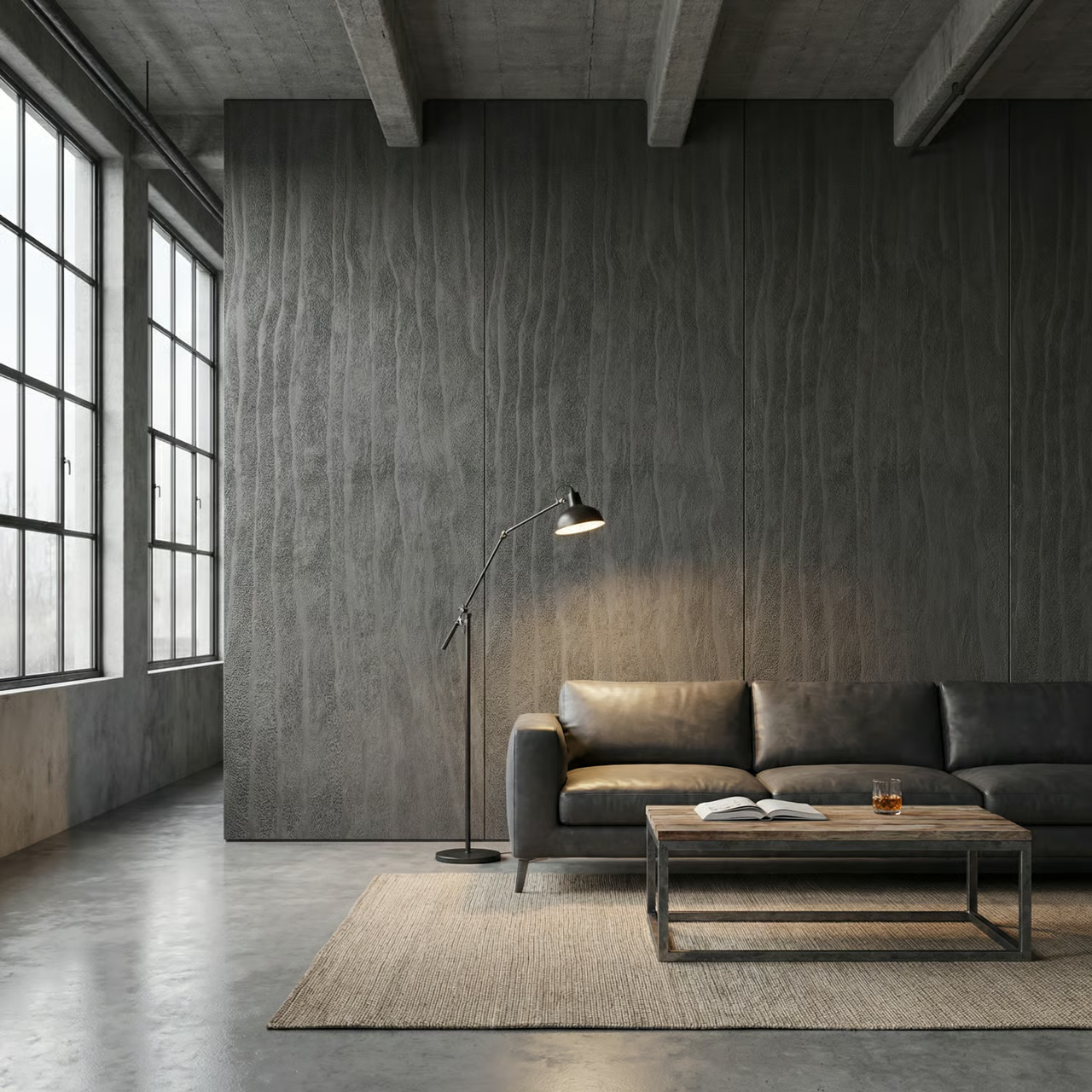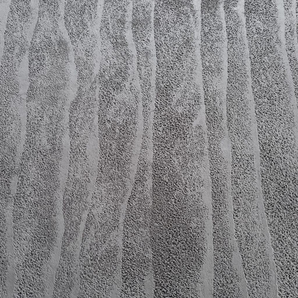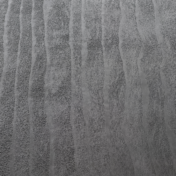 Tekstura inspirowana piaskiem ukształtowanym przez wodę · Pionowe, faliste żłobienia o organicznym, nieregularnym przebiegu · Mineralna, ziarnista faktura przypominająca piasek plażowy · Dynamiczny, trójwymiarowy wzór tworzący efekt kinetycznej rzeźby · Kolor ciemny grafitowy z ciepłym podtonem i naturalną grą światła i cienia · Wielkoformatowy wzór na powierzchni 3000×1200 mm