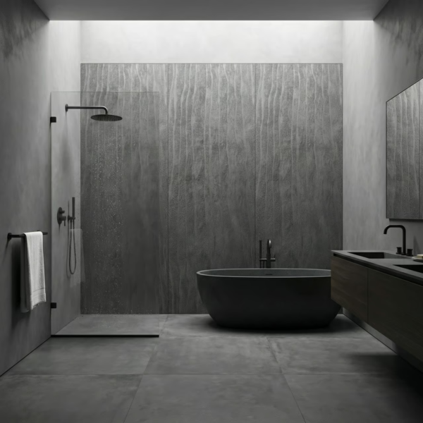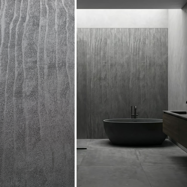 Panel ścienny Onda Mineral Grigio o wymiarach 3000×1200 mm to nowoczesny materiał wykończeniowy z kompozytu kwarcowo-polimerowego. Wytwarzany poprzez wytłaczanie zmielonego kwarcu i polimeru pod wysokim ciśnieniem, zapewnia pełną wodoodporność i trwałość. Powierzchnia odwzorowuje teksturę piasku ukształtowanego przez wodę — pionowe, faliste żłobienia tworzą dynamiczny, trójwymiarowy wzór. Ciemny grafitowy odcień z ciepłym podtonem podkreśla głębię falistych żłobień.