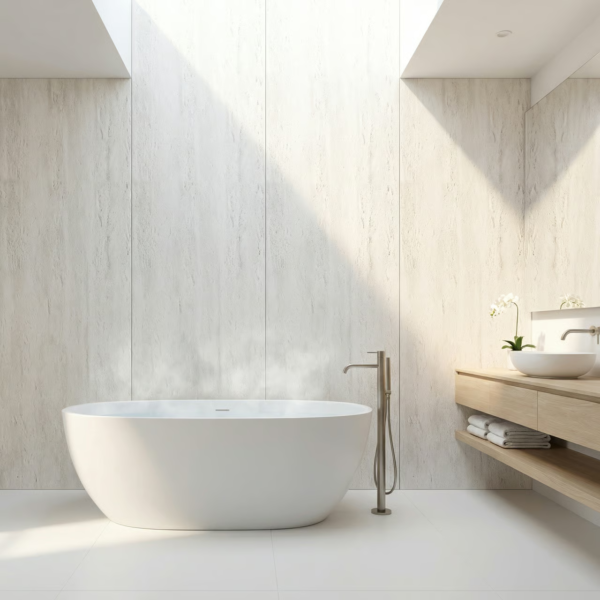 Panel ścienny Pietra Mineral Bianco o wymiarach 2400×1200 mm to nowoczesny materiał wykończeniowy z kompozytu kwarcowo-polimerowego. Wytłaczany pod wysokim ciśnieniem, wiernie odwzorowuje teksturę naturalnego trawertynu z charakterystycznymi porami i subtelnym żyłkowaniem vein-cut. Matowe wykończenie w czystej bieli z delikatnymi cieniami nadaje wnętrzom elegancję klasycznego włoskiego kamienia. Grubość zaledwie 4 mm zapewnia łatwy montaż, a pełna wodoodporność pozwala na zastosowanie w łazienkach i na elewacjach.