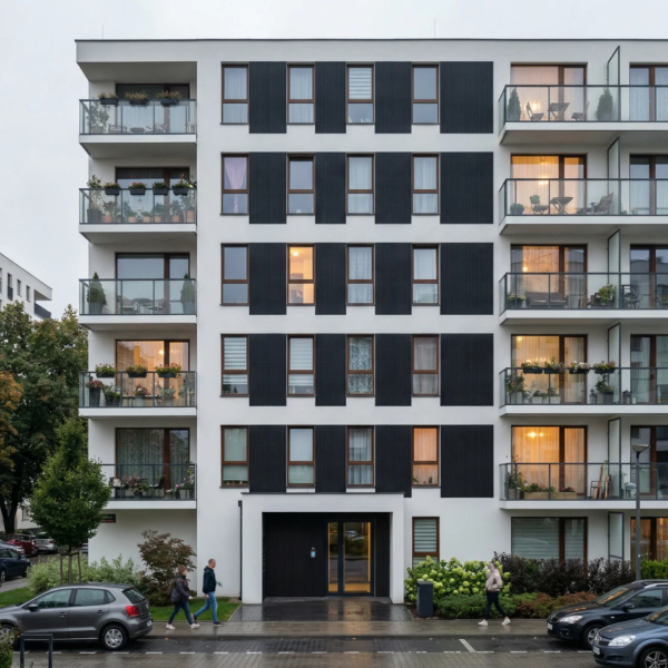 Płyta elewacyjna Line Mineral Nero o wymiarach 3000×1200 mm to nowoczesny kompozyt kwarcowo-polimerowy z charakterystyczną teksturą pionowych żłobień. Materiał powstaje poprzez wytłaczanie zmielonego kwarcu i polimeru pod wysokim ciśnieniem. Powierzchnia przypomina szczotkowany kamień lub ryflowany beton w głębokiej, matowej czerni. Grubość 7 mm zapewnia lekkość montażu bez obciążania konstrukcji. Panel doskonale sprawdza się na elewacjach budynków mieszkalnych i komercyjnych.