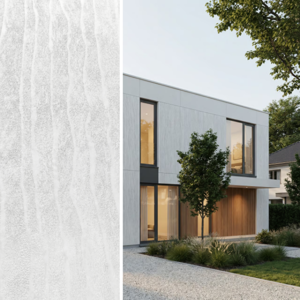 Tekstura inspirowana piaskiem ukształtowanym przez wodę · Pionowe, faliste żłobienia o organicznym, nieregularnym przebiegu · Mineralna, ziarnista faktura przypominająca piasek plażowy · Dynamiczny, trójwymiarowy wzór tworzący efekt kinetycznej rzeźby · Kolor czysty biały z delikatnymi cieniami widocznymi w zagłębieniach fal · Matowe wykończenie odporne na warunki atmosferyczne i blaknięcie