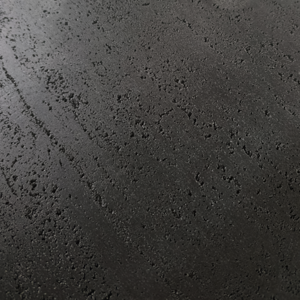 Wierna reprodukcja tekstury naturalnego trawertynu · Charakterystyczne pory i kawerny rozmieszczone nieregularnie · Subtelne pionowe żyłkowanie w stylu vein-cut · Głęboki czarny kolor z subtelnymi cieniami